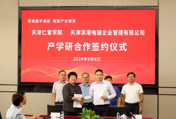會(huì)上,天津仁愛學(xué)院分別與天津?yàn)I港電鍍企業(yè)管理有限公司、天津市歐澤金屬表面處理有限公司、天津德威金屬表面處理有限公司簽署產(chǎn)學(xué)研合作協(xié)議;天津德威金屬表面處理有限公司與天津仁愛學(xué)院舉行“產(chǎn)教融合實(shí)踐基地”揭牌儀式。